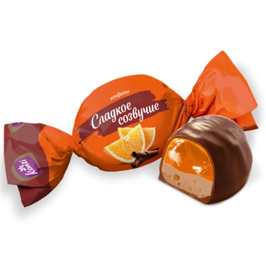 Souffle-Jelly Chocolates "Sweet Consonance" Orange, Konti, 226g / 7.97oz Glazed candies consisting of orange-flavored jelly and chocolate-flavored souffle.