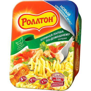 Instant Hot Chicken Noodles, Rollton, 90g/ 3.17oz Ingredients: noodles, seasoning broth, dried vegetables, dry soy sauce, sugar, yeast extract, dried chicken meat, spices, palm oil, anti-caking agent E551, dried vegetables