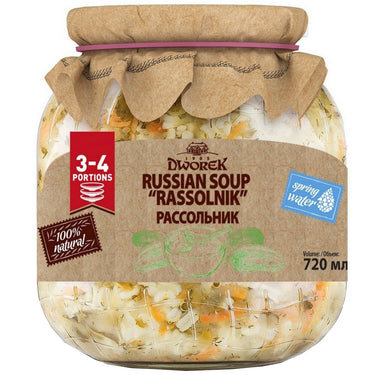 Sour Pickle Soup | Rassolnik, Dworek, 1.58 lb / 720 g Pickle soup or how it's known in Russia - Rassolnik is a rich and hearty soup. An amazing combination of various ingredients that are unmixable in their nature gives the soup a rich bouquet of tastes - sour and crunchy pickles, soft pearl barley, aromatic spices.