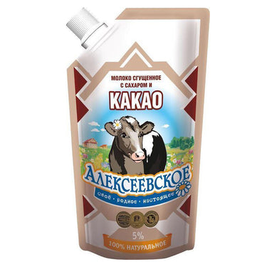 Sweet Сondensed Milk with Cocoa Soft Pack, Alekseevskoe, 9.52oz / 270g Sweet condensed milk is produced according to the classic recipe using only natural ingredients. Only selected whole milk is used for its production.