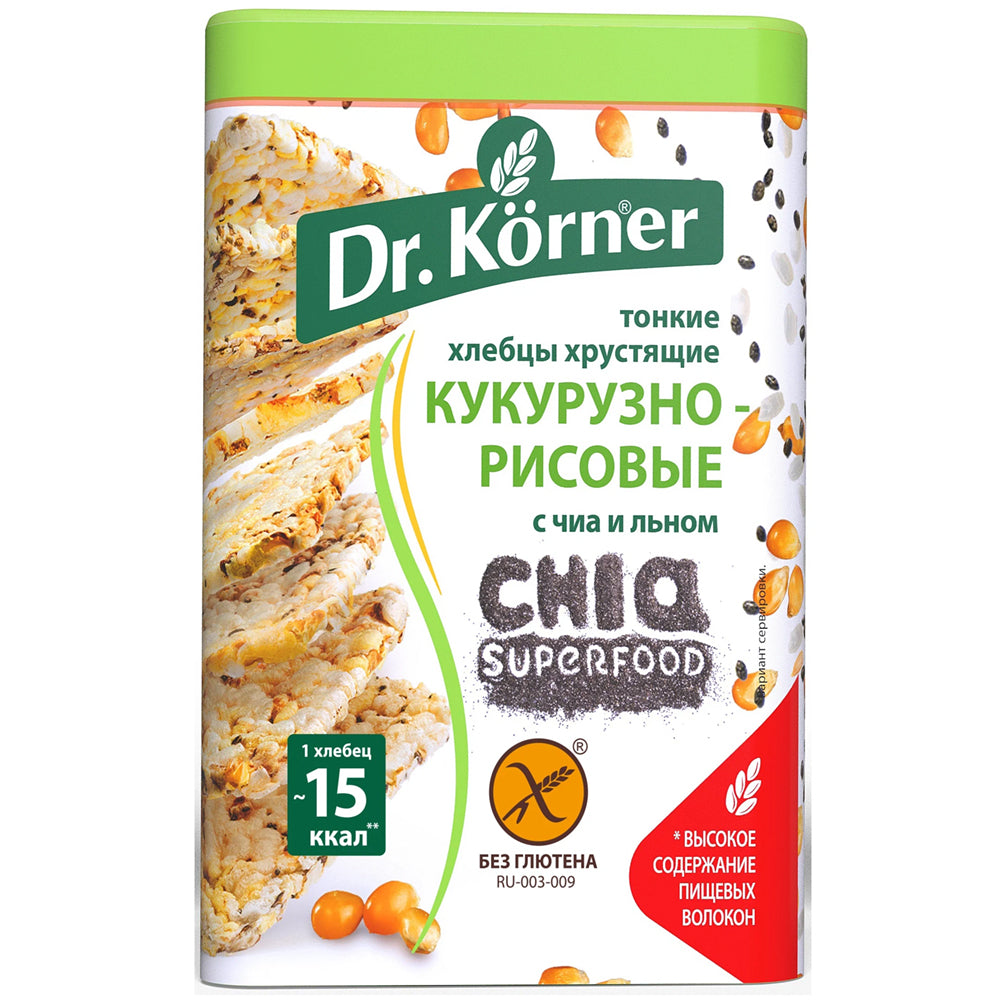 Crispy Corn-Rice Bread with Chia & Flax, Dr.Korner, 100g/ 3.53oz DR. KORNER Crispy corn and rice bread with chia seeds and flax is a thin square whole grain bread. Loaves are easily digested and give a feeling of satiety, giving the body all the benefits of whole grains, nutrients and vitamins. Ideal as an independent snack or a base for a sandwich