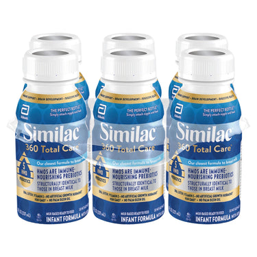Similac 360 Total Care Ready to Feed is a convenient, milk-based infant formula with iron, featuring 5 HMO prebiotics to support immune and digestive health.