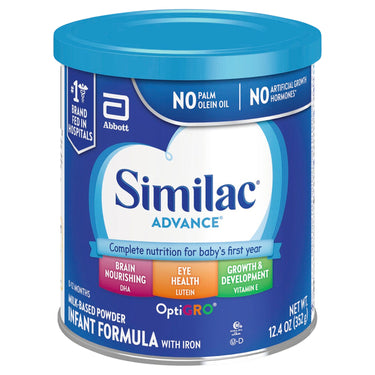 Similac Advance is a milk-based, iron-fortified infant formula with OptiGro, supporting brain and eye development for infants aged 0-12 months.