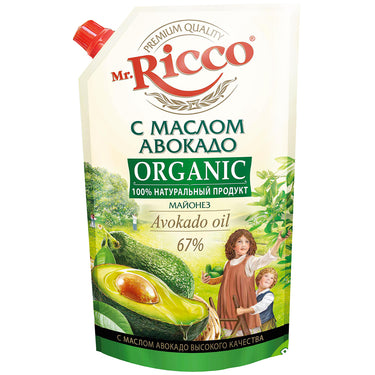 Organic Mayonnaise with Avocado Oil 67%, Mr.Ricco, 400ml/ 13.53 fl oz Ingredients: Refined deodorized sunflower oil, water, sugar, egg yolk, extra virgin avocado oil, salt, mustard oil, acetic acid acidity regulator, carotene dye, green vegetable extract (safflower and genipes).