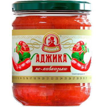 Caucasian Adjika, Zhirnov, 200g/ 7.05 oz Ingredients: drinking water, sweet pepper, salt, hot chili pepper, refined deodorized sunflower oil, garlic, acetic acid, stabilizer xanthan gum. GMO-free.