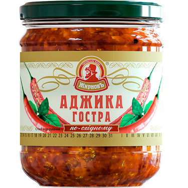Hot Adjika Eastern Style, Zhirnov, 200g/ 7.05 oz Ingredients: drinking water, sweet pepper, hot chili pepper, coriander, salt, refined deodorized sunflower oil, garlic, black pepper, acetic acid, fenugreek, flavor enhancer monosodium glutamate, zera, hops-sun. GMO-free.