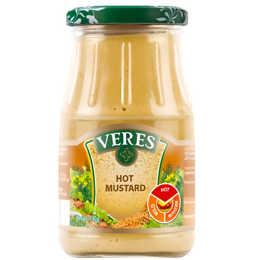 Hot Mustard, Veres, 190g/ 6.7oz Ingredients: water, hot mustard seed, sugar, white mustard seed, salt, acidity regulator, acetic acid, refined deodorized sunflower oil, stabilizer xanthan gum, preservative sodium benzoate, antioxidant sodium metabisulfite, mustard flavor, capsicum extract, ground cloves, natural dye turmeric extract.