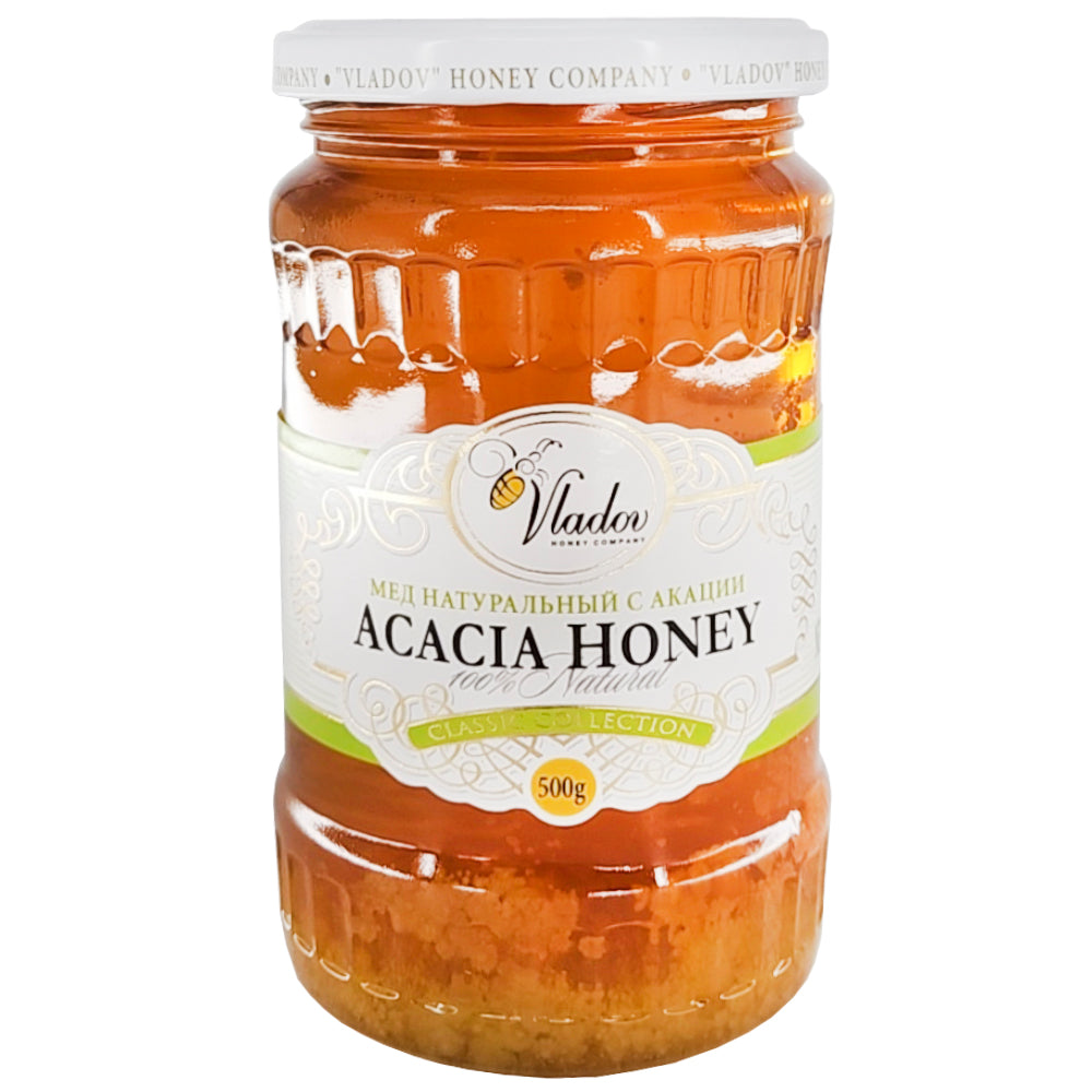 Natural Acacia Honey, Vladov, 500g/ 17.64oz This honey consists of 40% fructose and 36% glucose, which gives a delicate, not cloying taste without bitterness. Acacia honey is rich in B vitamins, contains vitamins A and C.