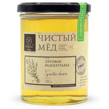Pure Honey "Meadow Grass", Peroni, 500 g/ 17.64oz Meadow May grass is one of the most popular and widespread varieties. It is unique in that it contains a lot of pollen from different colors of the central part of Russia. Nowhere else in the world will you find such a combination of plants - clover, chamomile, sunflower, sage, thyme, etc