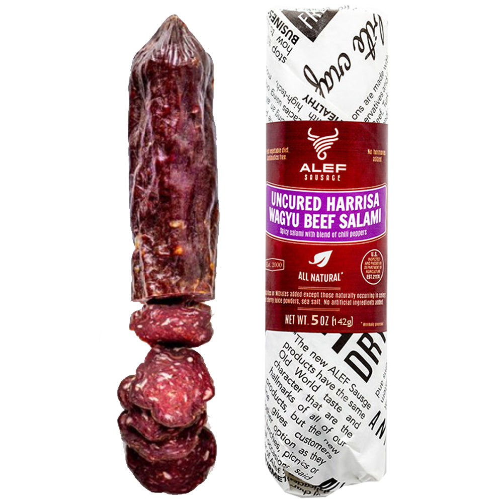 Uncured Beef Salami HARISSA with Chilli Peppers Blend, Alef, 142g/ 5 oz Founder Chef Alec Mikhaylov scoured the globe for just the right blend of peppers to flavor this 100% American wagyu beef salami that pays tribute to one of his favorite condiments, the smoky red North African chili paste known as harissa. Chef Alec balances the bright heat of Mexican serrano peppers and fruity Aleppo peppers with garlic and other spices. It’ll bring the heat, along with all-natural premium beef, to your next charcuterie board.