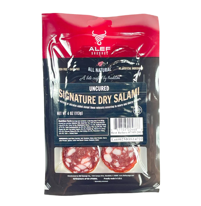 Alef Uncured Signature Dry Salami 113g Gourmet Sliced Meat Set. Uncured All Natural Salami. NITRATE FREE, NITRITE FREE, MSG FREE, DAIRY FREE, GLUTEN FREE. Handcrafted all beef salami with a bit of salt, pepper and garlic. Traditional Old Word recipe. Blend in nutmeg and other spices and finish with a hint of maple smoke Great Price at BalPary Russian Iranian Afghans Iraqi Arab Mediterranean Middle East Products Online App and Free Delivery More description and ingredients will be soon. Thanks for your understanding.