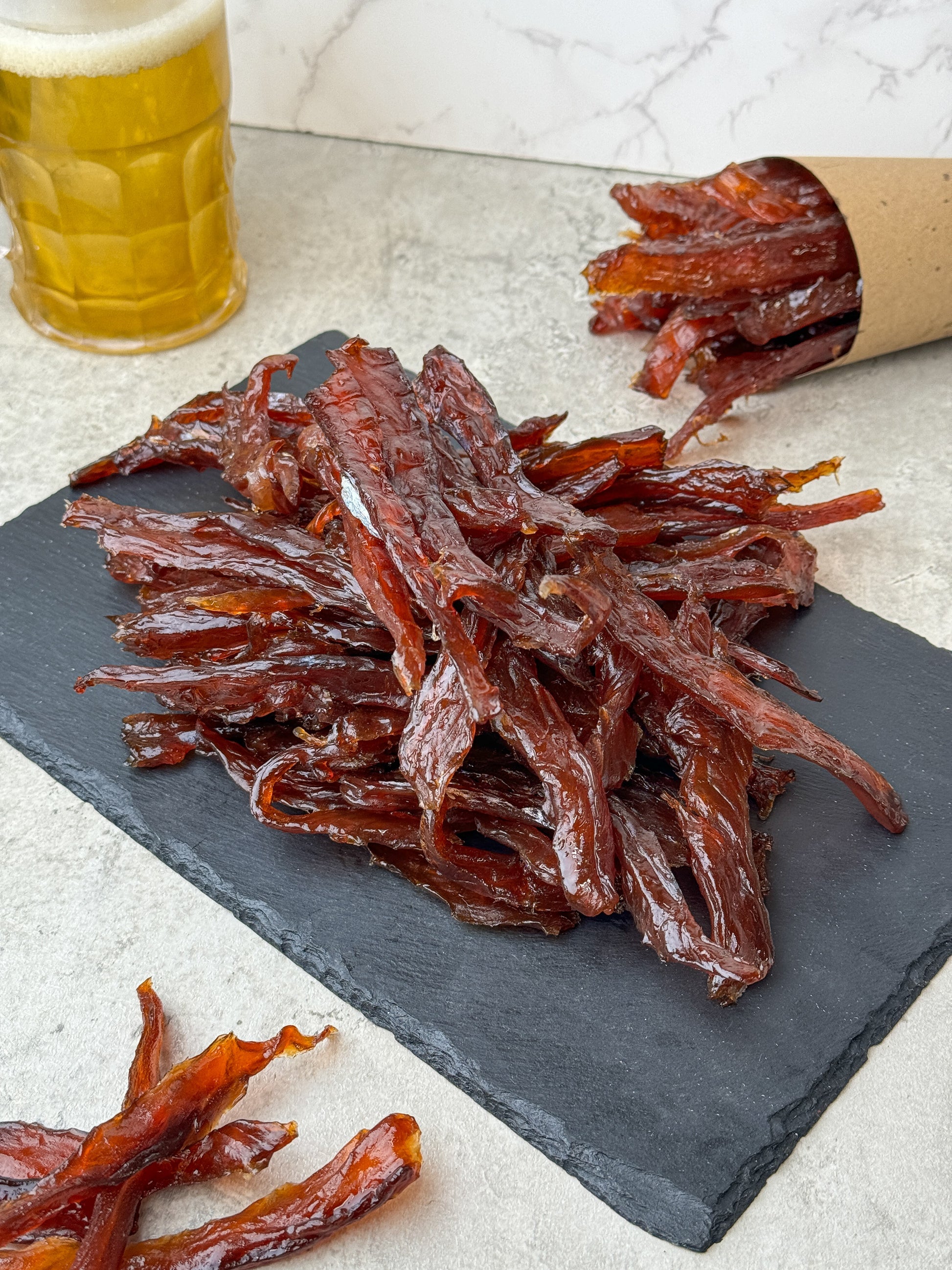 Наш лосось Jerky сделан из натурального лосося, выловленного в чистых ледяных водах Северной Атлантики. Каждый лосось вручную разделывается, тщательно приправляется и медленно коптится на вишневых и ольховых дровах в течение более 24 часов. Этот лосось идеально подходит для здоровой, легкой и вкусной закуски — он богат жирными кислотами омега-3 и имеет прекрасный вкус.